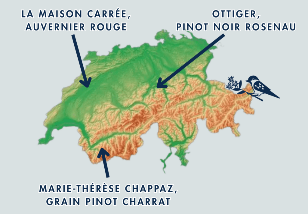 Warmer, sun-drenched slopes give fuller, darker, spicier Pinot. Sometimes blended with Gamaret or Cornalin for depth. - Vaud & Geneva (French speaking Switzerland – south and west)